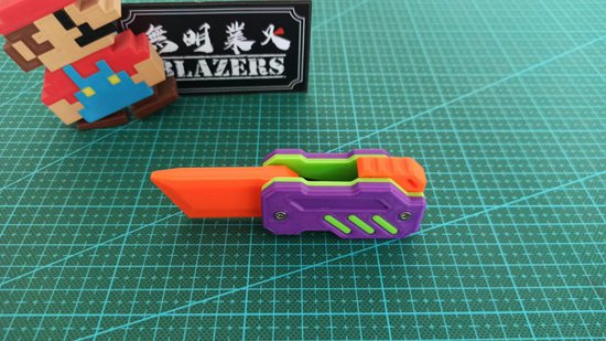 这是一把塑料小刀,由3D打印制成,利用重力和摩擦力原理,摆弄机关即可弹出或隐藏刀身。它橙绿相间,体型矮胖,被发布者昵称为“小萝卜”。