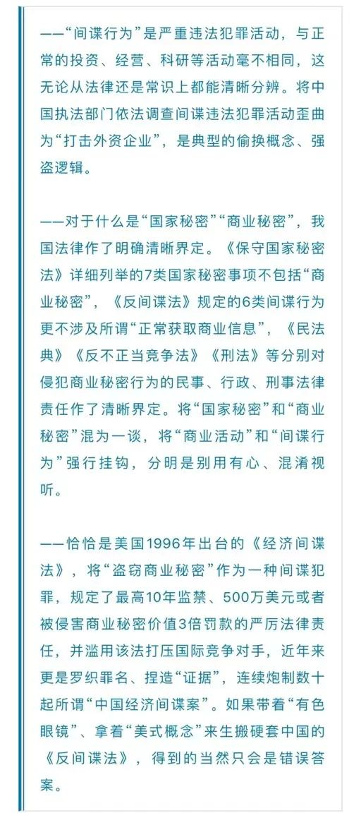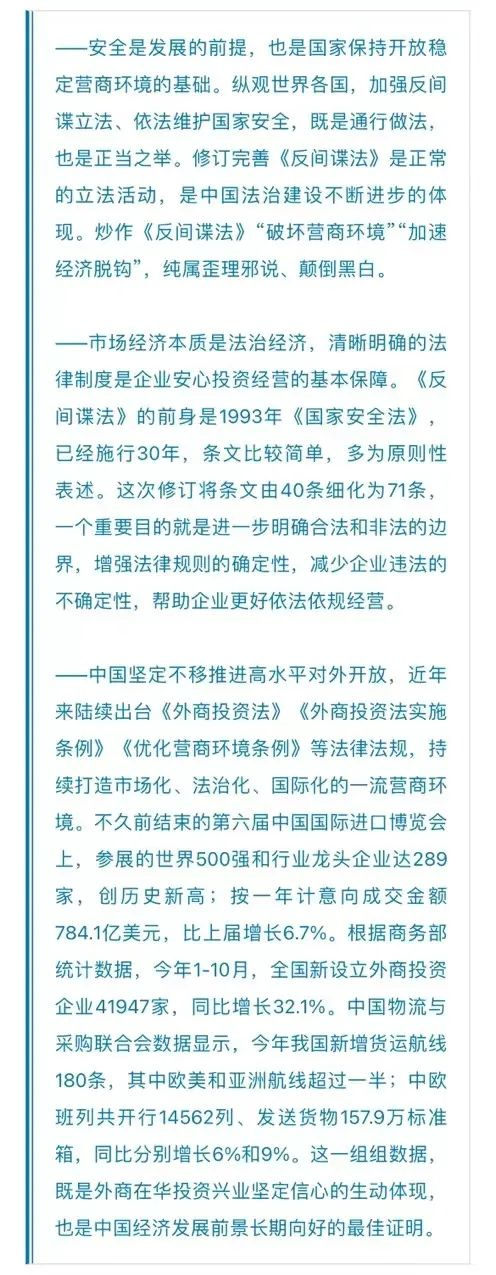 事实上,《反间谍法》打击的是极少数危害国家安全的间谍行为,不针对正常商业活动,不会对外企在华合法投资经营造成任何影响。