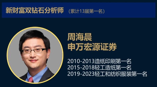 其中,继国盛证券的杨涛后,申万宏源证券的周海晨,成为新财富史上第二位双钻石分析师。2010年至2013年,周海晨在造纸印刷领域获得第一名;2015年至2018年,是轻工制造领域第一名;2019年至2023年,是轻工和纺织服装第一名。