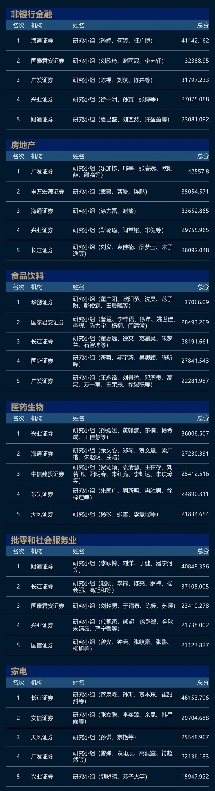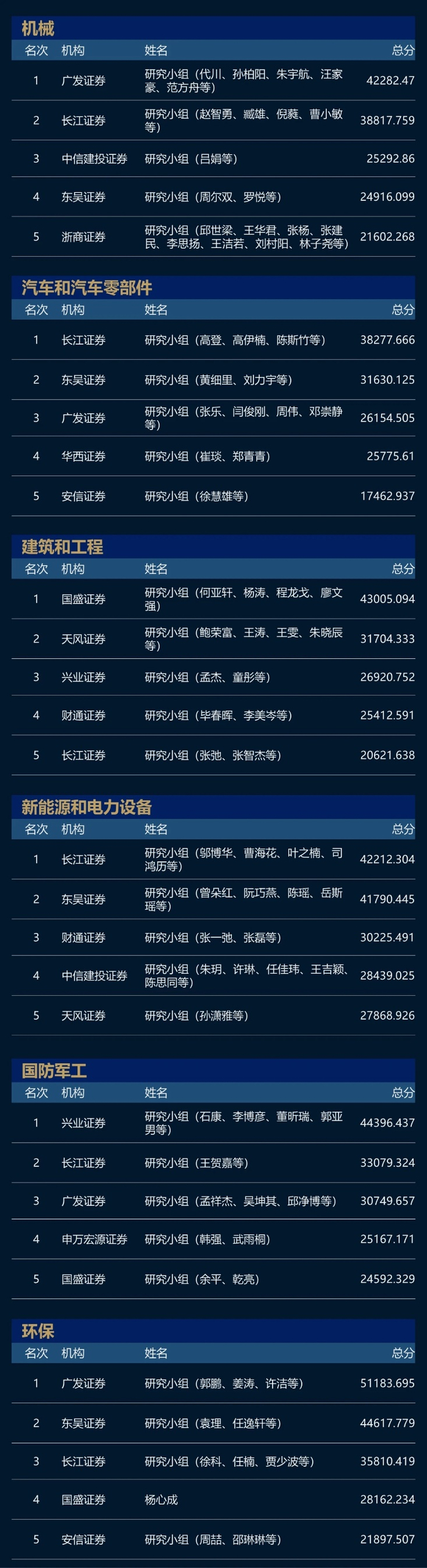 策略研究领域,最佳分析师榜首为天风证券刘晨明研究小组。此后依次是长江证券包承超、申万宏源证券王胜、广发证券戴康、兴业证券张启尧等研究小组。