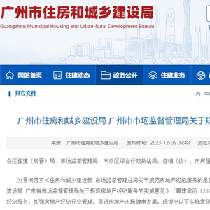12月5日,广州市住房和城乡建设局、广州市市场监督管理局联合发布关于规范房地产经纪服务的实施意见,进一步规范房地产经纪服务,加强房地产经纪行业管理,促进房地产市场健康发展。
