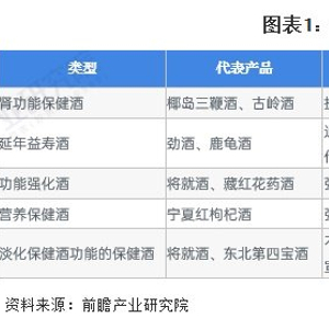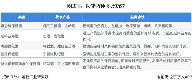 保健酒根据其原材料的不同,以及各产品的配方差别,形成了具有各种不同功效的保健酒种类。这些产品的类型主要包括肾功能保健酒、延年益寿保健酒、功能强化保健酒、营养保健酒和其他保健酒。