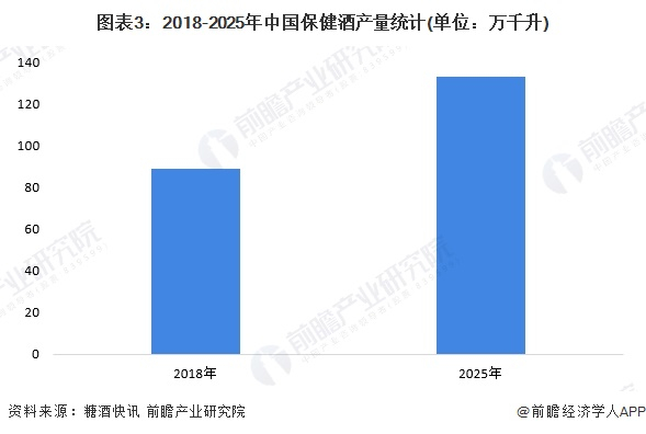 近年来,我国保健酒市场扩张迅猛,产销两旺。据糖酒快讯数据,2018年,我国保健酒企业共生产保健酒89.1万千升,比2017年同比上涨7.9%。预计未来我国保健酒产量仍将继续增长,到2025年,全行业保健酒产量将达到133万千升左右,年均复合增长率达到5.9%。