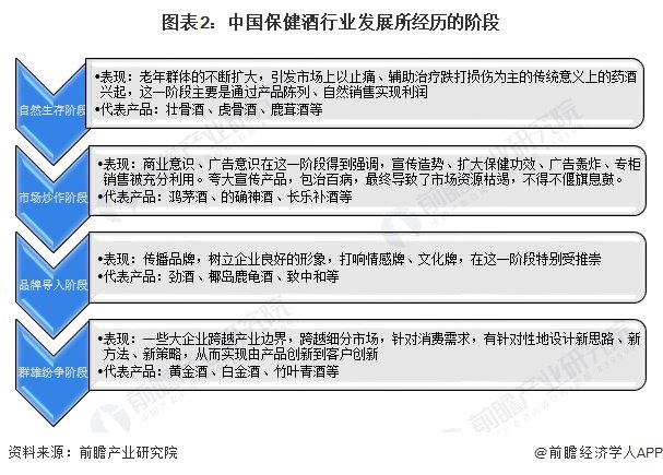 具体来看,中国保健酒市场发展经历了自然生存、市场炒作、品牌导入以及群雄纷争等四个阶段。目前,我国保健酒行业正处于群雄纷争阶段,主要表现为大企业针对消费者需求,有针对地涉及新产品、新策略。