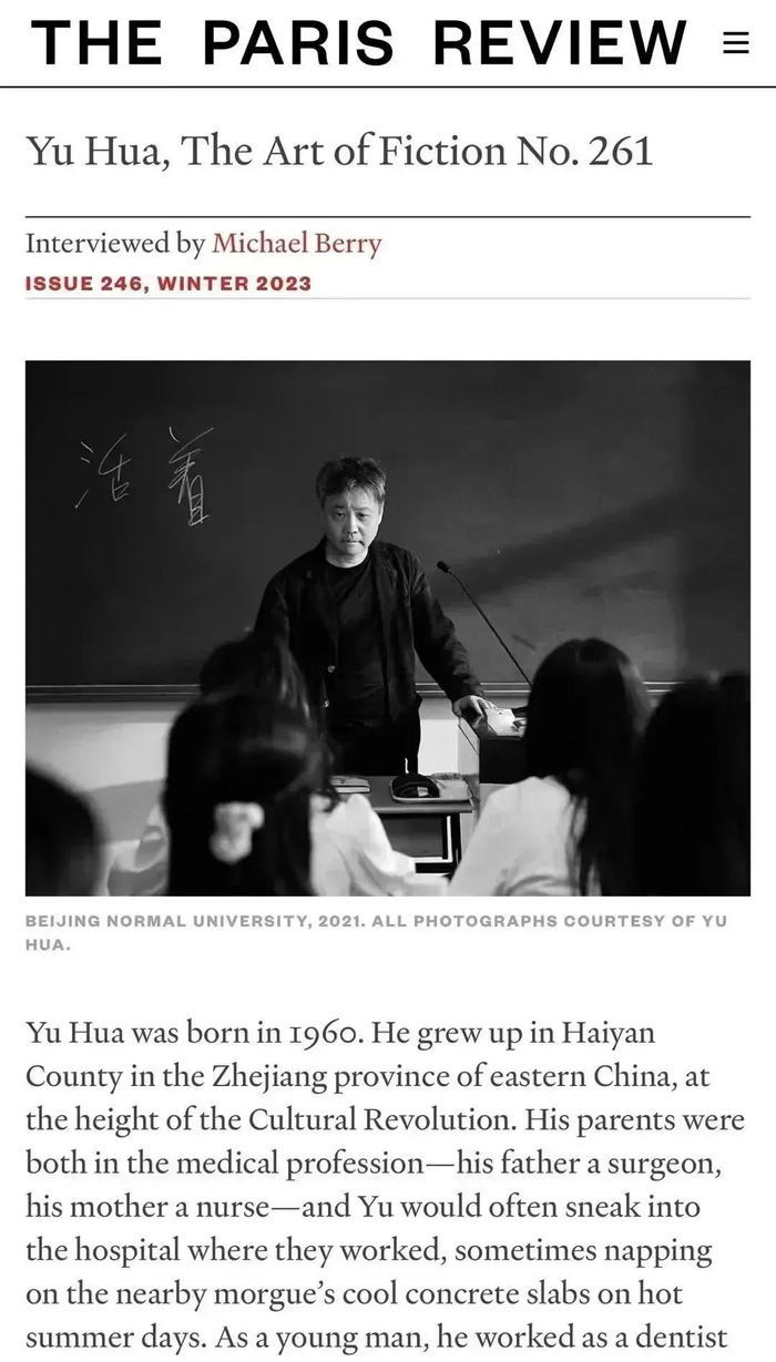 近日,著名文学刊物《巴黎评论》(The Paris Review)的“作家访谈”栏目发表了对作家余华的专访。这是中国籍作家第一次登上《巴黎评论》“作家访谈”。