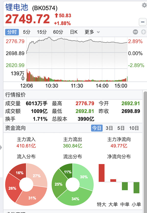 12月6日,能源金属、锂电池等锂电产业链板块涨幅居A股前列,其中,能源金属板块收涨5.47%,锂矿概念股如西藏矿业、天齐锂业、融捷股份、赣锋锂业、天华新能、赣锋锂业涨幅均超5%;锂电池板块收涨1.88%,天宏锂电、德瑞锂电、力王股份、科恒股份涨幅均在20%以上。