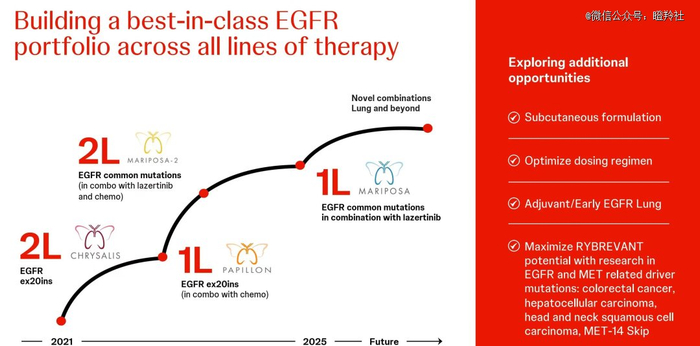 针对埃万妥单抗所表现出来的潜力,强生分别通过MARIPOSA-1、MARIPOSA-2、PAPILLON、CHRYSALIS系列临床来分别验证其在EGFR突变初治患者、EGFR ex20ins突变一二线患者的疗效。