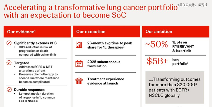 12月5日,强生在投资者日上放出一个重磅炸弹:其核心产品之一的Amivantamab(埃万妥单抗)在肺部疾病组合的销售峰值为50亿美元,在一线的市占率剑指50%。