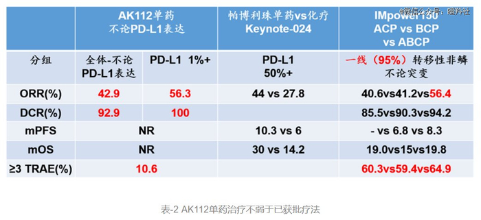 再以AK-112不论PD-L1表达肺癌患者试验横向对比K药vs化疗、罗氏Impower150研究(非头对头,仅供参考),可以看到AK-112在疗效上仅输“阿特珠单抗+贝伐单抗+卡铂+紫杉醇”四联用药,安全性上完胜对比试验。