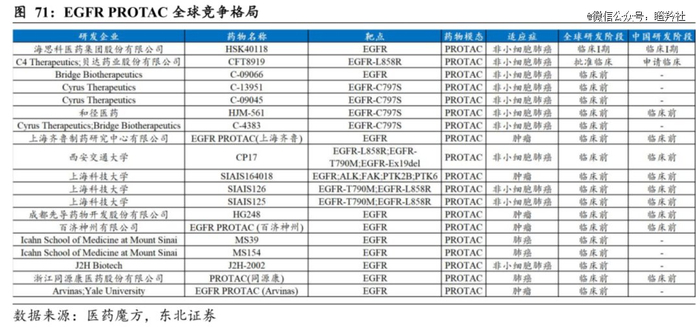 目前全球有大量EGFR Protac处于阶段,进入临床阶段的仅有海思科的HSK40118,贝达药业引进C4公司的CFT8919处于IND阶段,其余公司均处于临床前阶段。