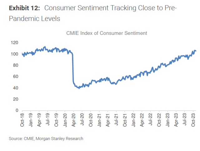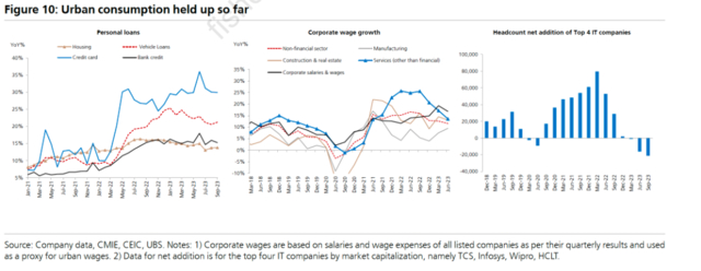 尽管与疫情期间的超额储蓄已基本消耗殆尽,但印度的城市人口消费在2023-2024财年迄今仍保持良好态势。我们认为,这部分得益于企业工资增长(城市的工资增速)和杠杆率上升(截至2023年9月,个人贷款同比增长18.2%)。
