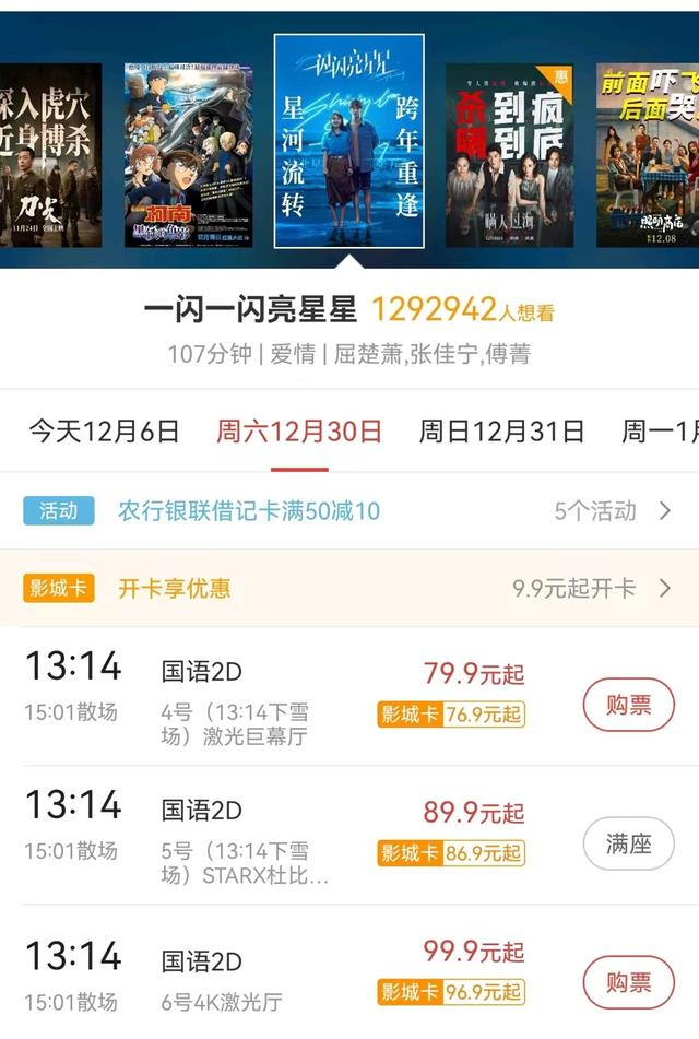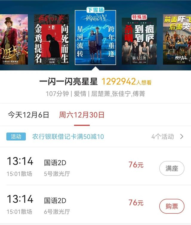 由屈楚萧、张佳宁领衔主演的奇幻浪漫爱情片《一闪一闪亮星星》由同名剧集原班人马共同打造,能够预售火爆,除了剧集热度基础和爱情类型在跨年档适销对路外,片方特意推出的“下雪场”也是重要因素。据悉,影片上映当天,全国有1314家影城在13时14分场次举行“下雪场”活动。记者在购票平台发现,上海多家影院都有“下雪场”,部分场次已经售罄。在电影市场淡季,面对突然火爆的“下雪场”,业内人士不由感叹,“年轻人的仪式感,让人始料不及。”