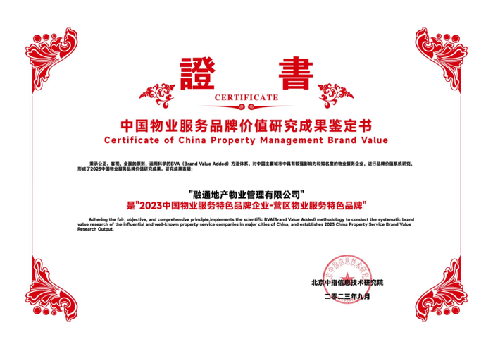 近日,“2023中国房地产品牌价值研究成果发布会暨第二十届中国房地产品牌发展论坛”在京举行,会上发布《2023中国房地产服务品牌价值研究报告》。融通地产物管公司荣获“2023中国物业服务特色品牌企业—营区物业服务特色品牌”“2023中国物业服务特色品牌企业—物业信息安全与保密领先品牌”两项荣誉。