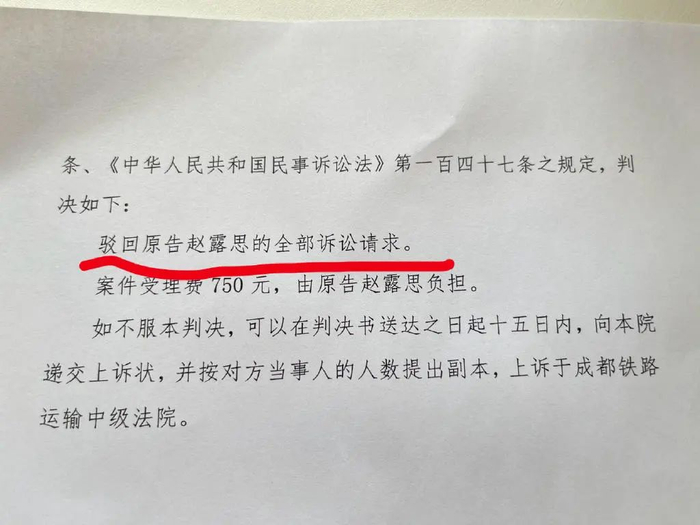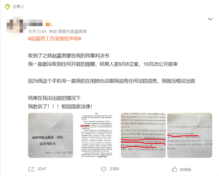 今天,有网友发了赵露思败诉的判决书:“我一直都没收到任何开庭的提醒,结果人家9月8立案,10月25公开庭审,因为我这个手机号一直我奶在用她也没跟我说有任何法院信息,我就压根没出庭。结果在我没出庭的情况下,我胜诉了。”