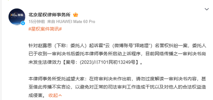 针对赵露思(下称:委托人)起诉霍*云(微博账号“拜姥湿”)名誉权纠纷一案,委托人已于收到一审判决书后委托本律师事务所启动上诉程序,目前网络传播之一审判决书尚未发生法律效力【案号:(2023)川7101民初13249号】。