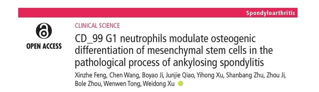 近日,海军军医大学第一附属医院(上海长海医院)关节骨病外科徐卫东教授团队,在强直性脊柱炎基础研究领域取得重要研究成果。在英国医学杂志子刊、国际风湿病学领域顶级期刊《风湿病年鉴》上以“原创论著”形式在线发表最新研究成果。