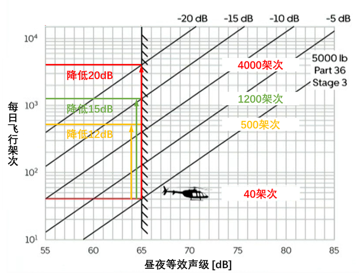 世界各国普遍要求为65分贝,按这个数字计算,以目前直升机的噪声水平,不考虑其他因素,每天仅可飞行40架次。若通过技术手段将直升机噪声级降低12分贝,则变为每日可飞行500架次;若降低15分贝,每日可飞行1200架次;若降低20分贝,每日可飞行4000架次。