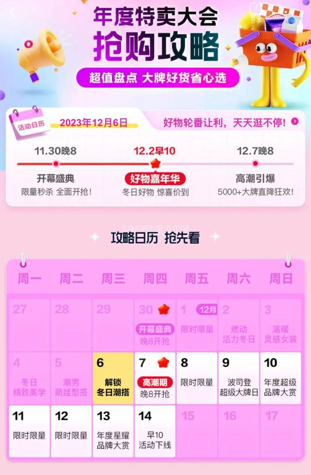 唯品会于11月30日开启了年度特卖大会,活动持续至12月14日上午10点。据了解,年度特卖大会将有5000多个大牌1折起售,众多爆款价格将创年内新低,唯品会将在商品丰富度、价格指数、规则简化等方面再次刷新纪录。