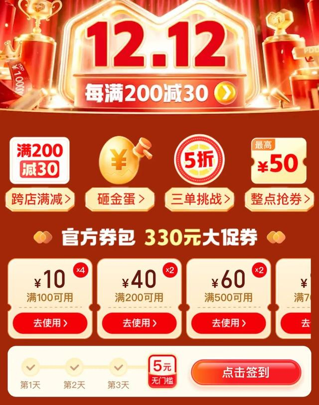 拼多多也开启了12.12大促,跨店满减门槛为每满200减30。相比于“双十一”,其“双十二”的会场宣传设置、商品类目等几乎没有变化。