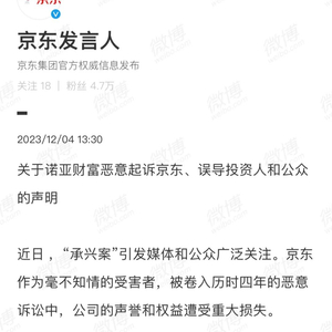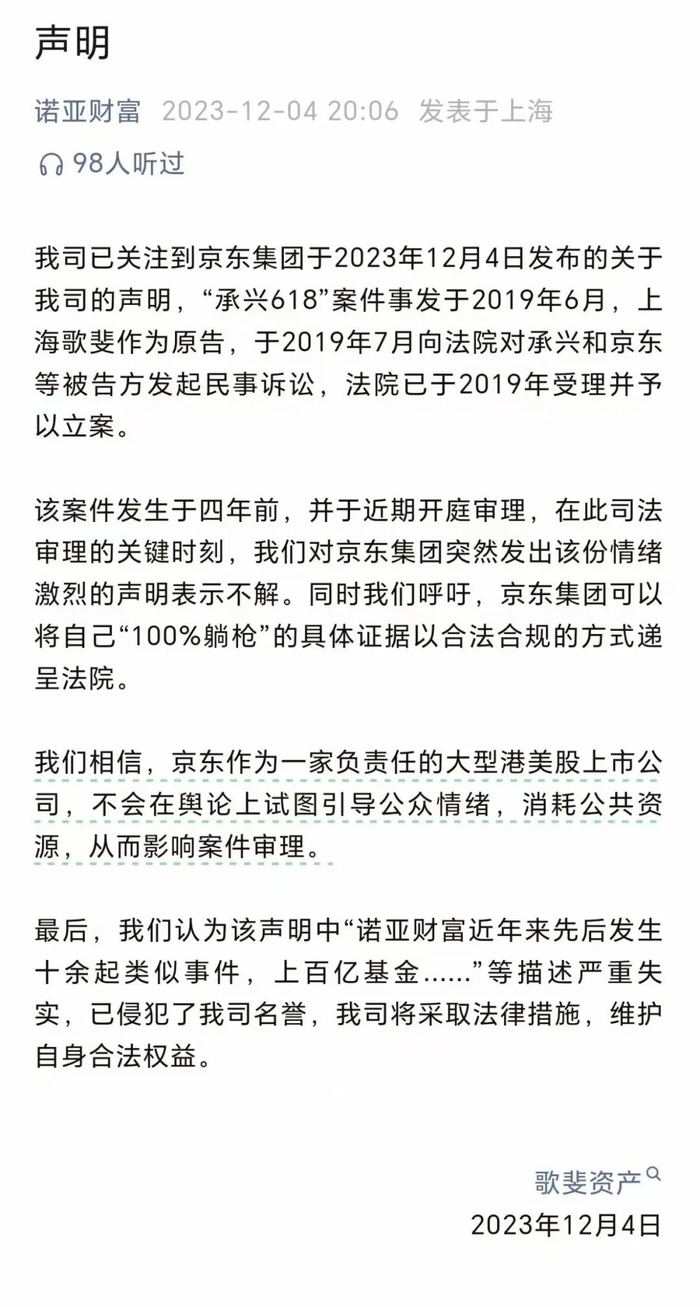 随后,诺亚公司发布声明回应称,“‘承兴618’案件事发于2019年6月,上海歌斐作为原告,于2019年7月向法院对承兴和京东等被告方发起民事诉讼,法院已于2019年受理并予以立案。该案件发生于四年前,并于近期开庭审理,在此司法审理的关键时刻,我们对京东集团突然发出该份情绪激烈的声明表示不解。”