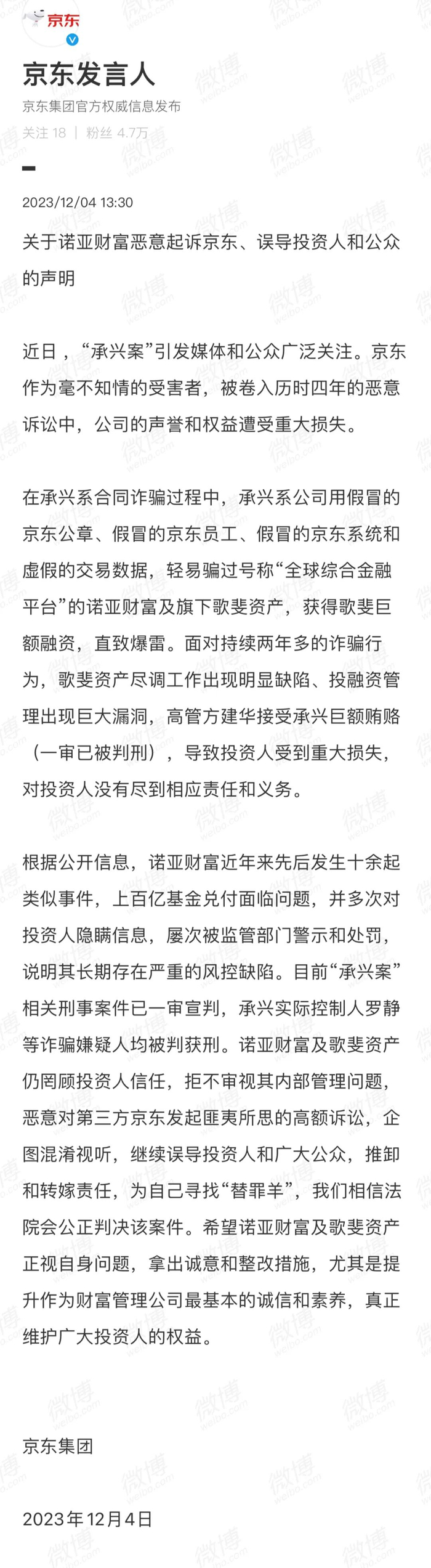 京东公司在声明中指出,根据公开信息,诺亚财富近年来先后发生十余起类似事件,上百亿基金兑付面临问题,并多次对投资人隐瞒信息,屡次被监管部门警示和处罚,说明其长期存在严重的风控缺陷。目前“承兴案”相关刑事案件已一审宣判,承兴实际控制人罗静等诈骗嫌疑人均被判获刑。诺亚财富及歌斐资产仍罔顾投资人信任,拒不审视其内部管理问题,恶意对第三方京东发起匪夷所思的高额诉讼,企图混淆视听,继续误导投资人和广大公众,推卸和转嫁责任,为自己寻找“替罪羊”。