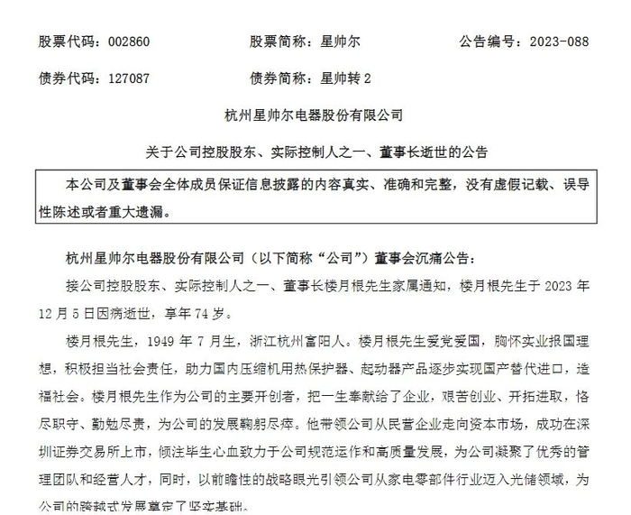 12月6日,星帅尔(002860.SZ)发布公告,接公司控股股东、实际控制人之一、董事长楼月根家属通知,楼月根于2023年12月5日因病逝世,享年74岁。公司董事会推举董事、总经理楼勇伟代行董事长职责,直至公司董事会选举董事长为止。