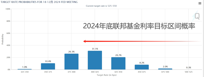 “美联储观察”工具的数据,目前明年底美联储利率落在3.75%-4%,以及4%-4.25%的概率分别为26.8%和31%。也就是说,市场更倾向于认为2024年美联储将降息125-150个基点。