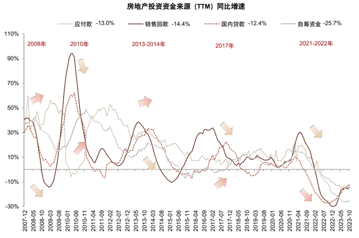 图表:与历次房企资金紧张阶段不同,本轮各项资金来源均出现明显下行