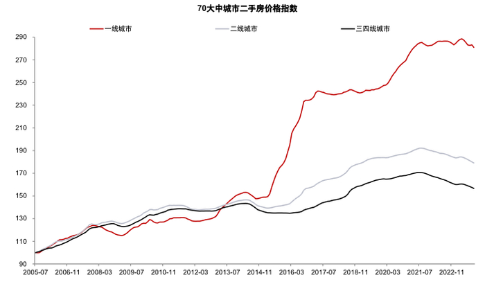 图表:一二三线城市二手房价格均有所回落,一手房价格较为稳健