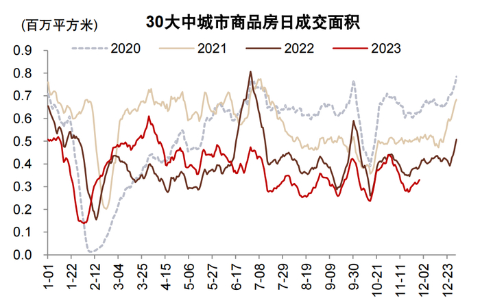 1) 房企资金来源:截至10月末,我们估算房企开发投资资金来源中,销售回款占55%,金融机构贷款占12%,自筹资金(包括权益和债券融资等)占33%。我们估算2021年7月以来,房企资金来源(TTM流量)已从最高的21万亿元下滑8万亿元(降幅39%),其中销售回款、贷款、自筹资金分别下滑4.6万亿元(降幅39%)、1.0万亿元(降幅39%)、2.4万亿元(降幅36%),销售回款下降的缺口最为明显。考虑到房企资金来源仍主要依赖销售回款、贷款贡献较少,我们认为房企信用恢复和贷款偿还根本上依赖于销售恢复。