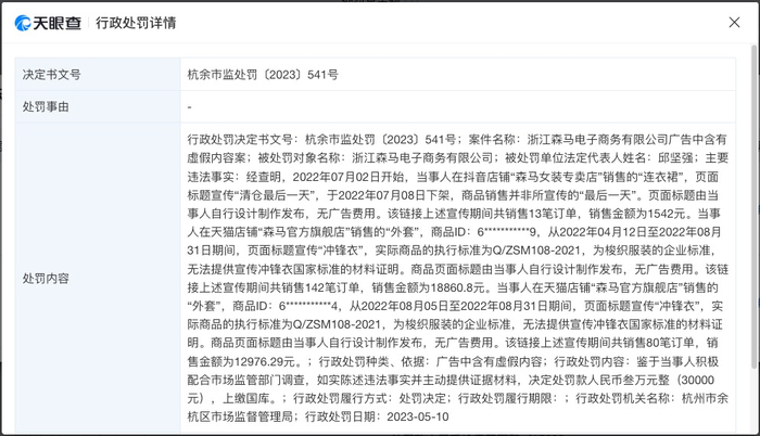 天眼查公开信息显示,浙江森马服饰股份有限公司的全资子公司浙江森马电子商务有限公司在今年5月因为“广告中含有虚假内容”被杭州市余杭区市场监督管理局给予行政处罚。处罚的具体内容中提及:“当事人在天猫店铺“森马官方旗舰店”销售的“外套”,商品ID:6***********9,从2022年04月12日至2022年08月31日期间,页面标题宣传“冲锋衣”,实际商品的执行标准为Q/ZSM108-2021,为梭织服装的企业标准,无法提供宣传冲锋衣国家标准的材料证明。”