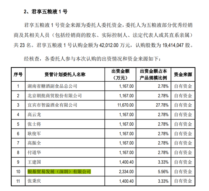 银基贸易也参与了上述混改,出资2334万元,通过君享五粮液1号认购了其中的5.56%。