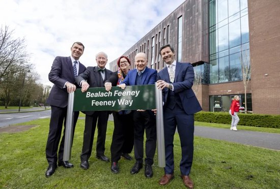 2023年,利默里克大学校园的主干道已更名为“费尼路”,学校领导和查克·费尼家人出席了活动仪式。查克·费尼曾通过大西洋慈善基金会,向利默里克大学捐赠了1.5亿欧元。图/Arthur Ellis/UL