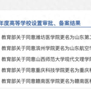 同意潍坊医学院更名为山东第二医科大学,同意滨州学院更名为山东航空学院,同意重庆科技学院更名为重庆科技大学,同意山西师范大学现代文理学院转设为山西电子科技学院,赣南医学院更名为赣南医科大学。