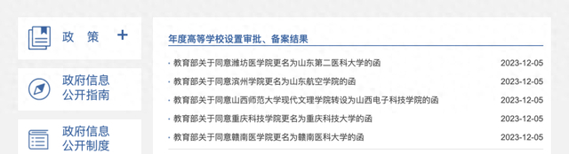 12月5日,教育部发布函件,同意3所学院更名大学,1所学院同层次更名,1所民办独立学院转设为公办: