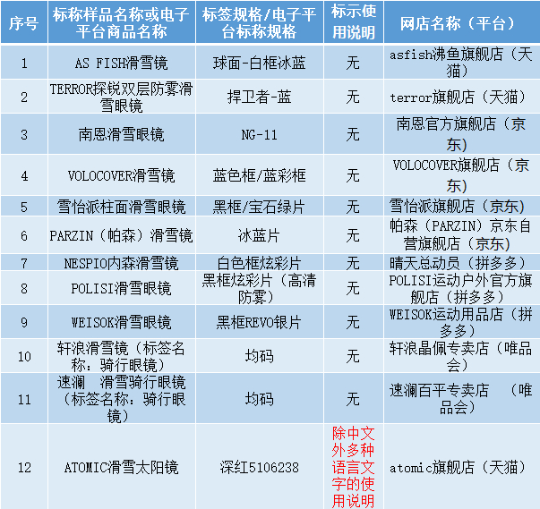 7批次未标注执行标准。涉及AS FISH滑雪镜、TERROR探锐双层防雾滑雪眼、雪怡派柱面滑雪眼镜、NESPIO内森滑雪镜、LOCLE滑雪眼镜、WEISOK滑雪眼镜、PROPRO滑雪眼镜;