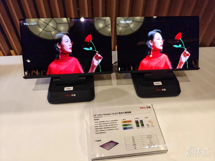 在目前业内高度关注的中尺寸OLED领域,TCL华星展示了多款相关产品,其中14英寸的Ultra Tandem OLED中尺寸柔性屏的最高亮度已经超过了2500nit,同时功耗相较普通OLED提升了30%,寿命提升了3.5倍。