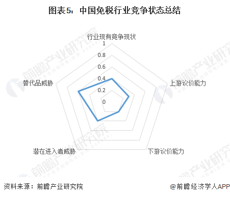 根据以上分析,对各方面的竞争情况进行量化,1代表最大,0代表最小,目前我国免税行业五力竞争总结如下: