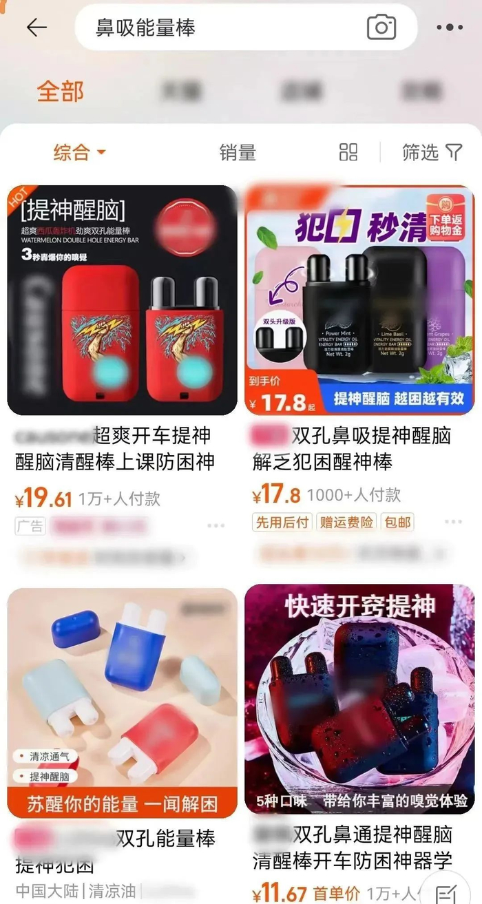 在电商平台搜索发现,不少线上商家在售卖这种“鼻吸能量棒”,价格多在几元至几十元之间,部分产品月销量已达上千件。