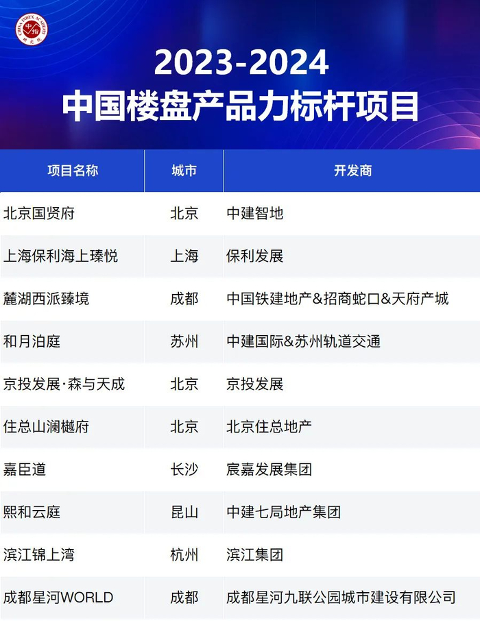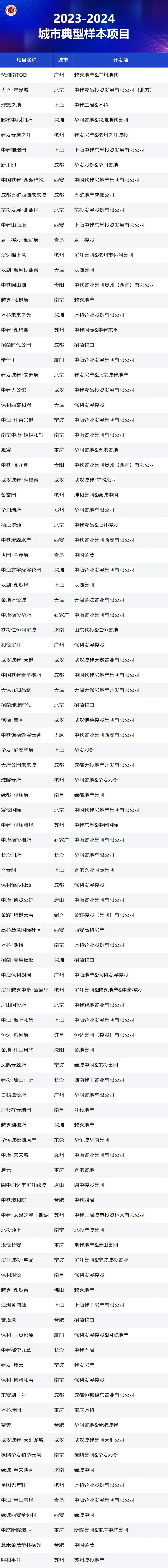 从国家统计局发布的数据上看,2023年1-10月,全国商品房销售面积同比下降7.8%,销售金额同比下降4.9%,市场仍面临下行压力,预计未来支持政策将继续落地,供需两侧渐成合力助力市场企稳。从需求特征来看,改善需求仍是重要支撑,同时,购房者在置业决策过程中亦愈加理性,对产品品质、品牌口碑、项目周边配套和物业服务等要素的关注度明显提升。在此背景下,中指研究院在中国房地产指数系统理论体系和架构的基础上,从百城价格指数样本项目中选取在所属城市有较强知名度和广泛影响力的典型样本项目,以“典型性”为基本原则,从销售表现、产品创新等方面对样本楼盘进行研究,最终得出“2023-2024城市典型样本项目”,在肯定项目典范代表地位的同时,也为市场提供学习和借鉴的标杆。