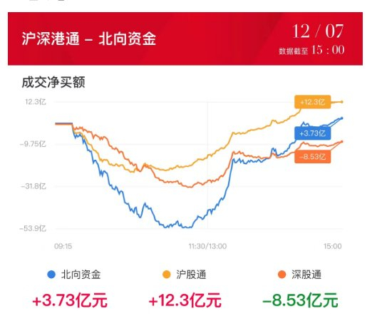 北向资金全天净买入3.73亿元,其中沪股通净买入12.26亿元,深股通净卖出8.53亿元。