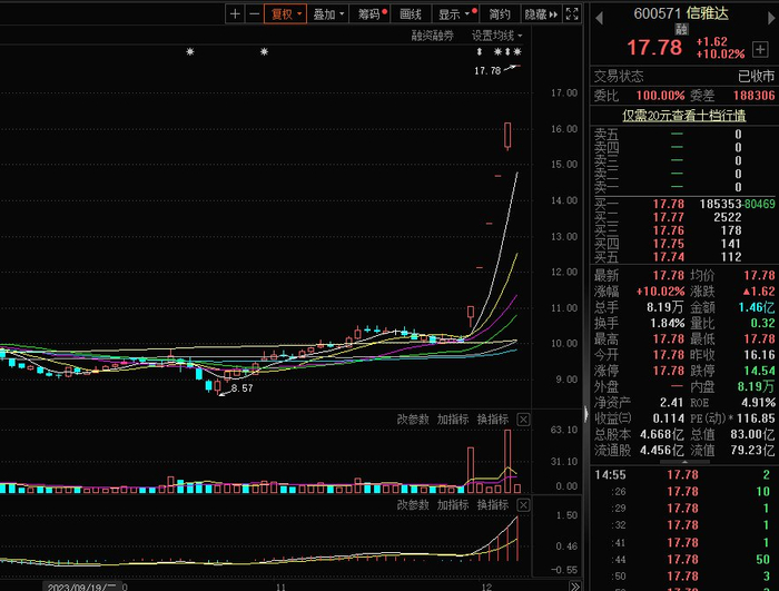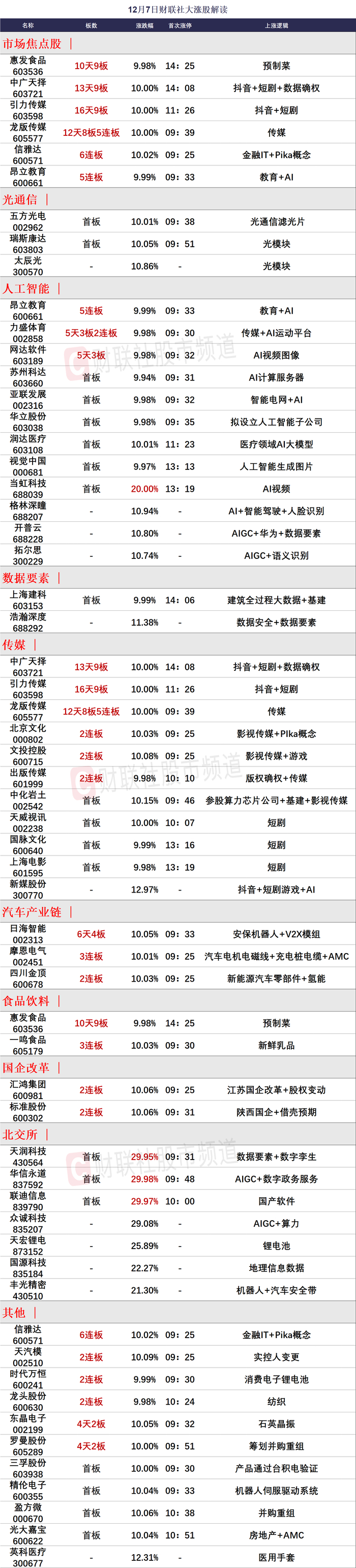 财联社12月7日讯,今日42股涨停,15股炸板,封板率为74%,信雅达6连板,龙版传媒、昂立教育5连板,摩恩电气、一鸣食品3连板,天汽模、文投控股、标准股份、汇鸿集团、四川金顶、北京文化2连板,惠发食品10天9板,中广天择13天9板,日海智能6天4板,东晶电子、罗曼股份4天2板,当虹科技20CM首板。北交所华信永道、联迪信息、天润科技30CM首板。盘面上,两市超3200家个股下跌;板块方面,传媒、数据确权、AIGC、数字水印等板块涨幅居前,减肥药、汽车零部件、创新药、盐湖提锂等板块跌幅居前。