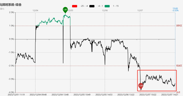 指标显示,今早短线情绪低开于低迷区附近后走出探底回升动作,不过受制于多数个股下跌以及高位股的持续分化,短线情绪盘中修复力度有限,全天维持低迷区下方窄幅震荡,尾盘短线情绪在部分抱团股跳水拖累下再度小幅探底并于低迷区附近报收。