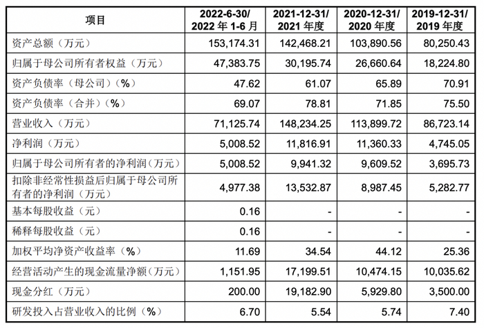 2019年-2022年上半年,大明电子营业收入分别为8.67亿元、11.39亿元、14.82亿元及7.11亿元;净利润分别为4745.05万元、1.14亿元、1.18亿元及5008.52万元。
