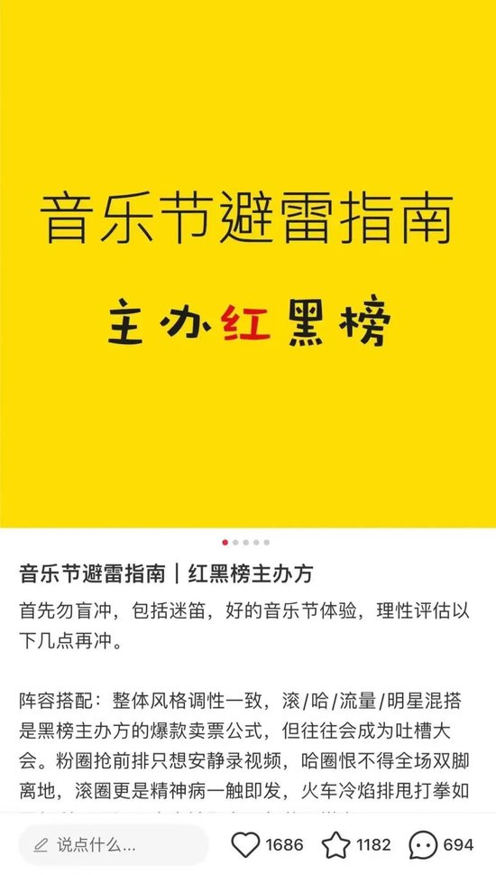 有网友在某社交平台整理了音乐节红黑榜,从艺人阵容、票价、主办方、场地、安保、城市、交通、住宿等各个方面教网友如何避雷,获得了1600多点赞和1000多收藏。
