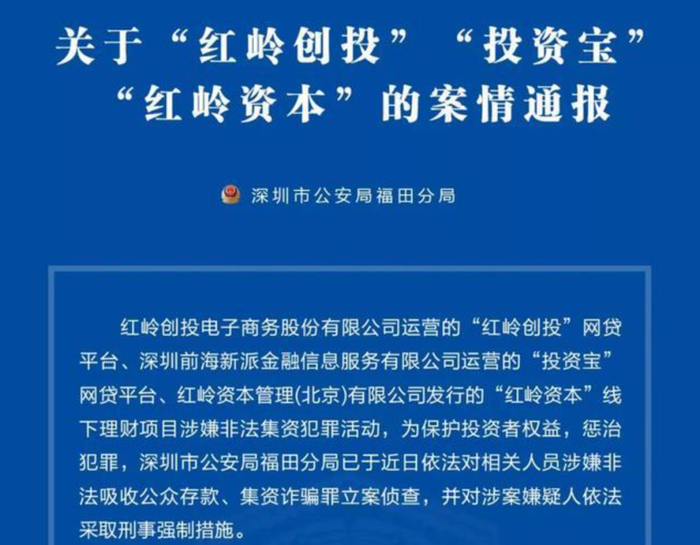 随后2021年9月25日,福田公安通报称,“红岭创投”网贷平台、“投资宝”网贷平台、“红岭资本”线下理财项目涉嫌非法集资犯罪活动,福田公安已于近日对相关人员涉嫌非法吸收公众存款、集资诈骗罪立案侦查,并对涉案嫌疑人依法采取刑事强制措施。