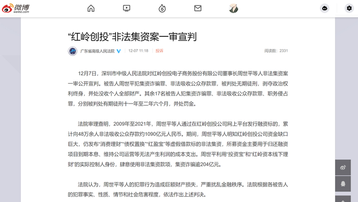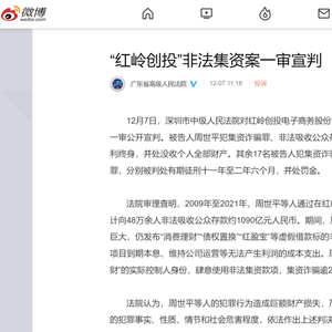 据广东省高级人民法院消息,12月7日,深圳市中级人民法院对红岭创投董事长周世平等人非法集资案一审公开宣判。