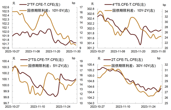方向性交易,国债期货11月中上旬偏强,下旬呈“V”字形走势,主力合约先降后升,长端表现好于短端。过去一个月TL主力合约累积涨幅0.84%,T上涨0.10%,TF下跌0.19%,TS下跌0.29%。