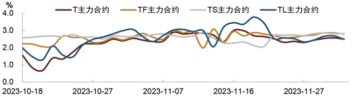 自10月中下旬以来,国债期货IRR水平整体抬升,其中长期限合约升势更为明显。考察各期限合约活跃CTD对应的IRR,TL和T主力合约的IRR从1.0%-1.5%的水平抬升至2.5%-3.0%,而TF主力合约IRR自2.0%附近上行至2.5%略上方,TS主力合约IRR升幅则略小。伴随期货IRR水平整体的抬升,投资者对国债期货正套空间和机会的关注度有所提升。