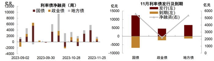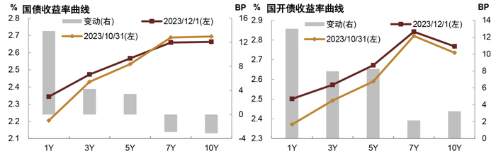 11月债券市场先强后弱,月末小幅回暖,除长端国债外,债券利率多数抬升,短端尤甚,曲线趋平。10月下旬以来,一方面,由于地产修复仍偏弱,导致工业品需求和价格在补库存后再次下滑,PMI重回荣枯线下方,出口在外需偏弱下也相对承压,经济动能再次放缓带动债券利率重新回落;另一方面,伴随央行加大OMO净投放以及人民币汇率趋于稳定,资金面重回均衡,资金利率中枢小幅回落也助推债市情绪修复,特别是短端券种。11月中下旬以来,伴随新增国债陆续发行,政府债券供给高增,银行间流动性重回紧平衡,存单等银行主动负债利率高居不下,叠加三部门召开金融机构座谈会,强调信贷前置以及房企融资支持,宽信用预期抬升,债券利率再次回调且曲线趋平。11月末,伴随资金面边际趋稳,叠加PMI数据进一步支撑债市情绪,债券利率回落。截至12月1日收盘,10Y国债活跃券(230018.IB)收在2.68%附近,10Y国开债活跃券(230210.IB)收在2.80%附近。资金利率层面,11月资金稳定性不足叠加跨月影响,资金利率先降后升,但跨月后明显转松。DR001降至1.61%,DR007降至1.80%。